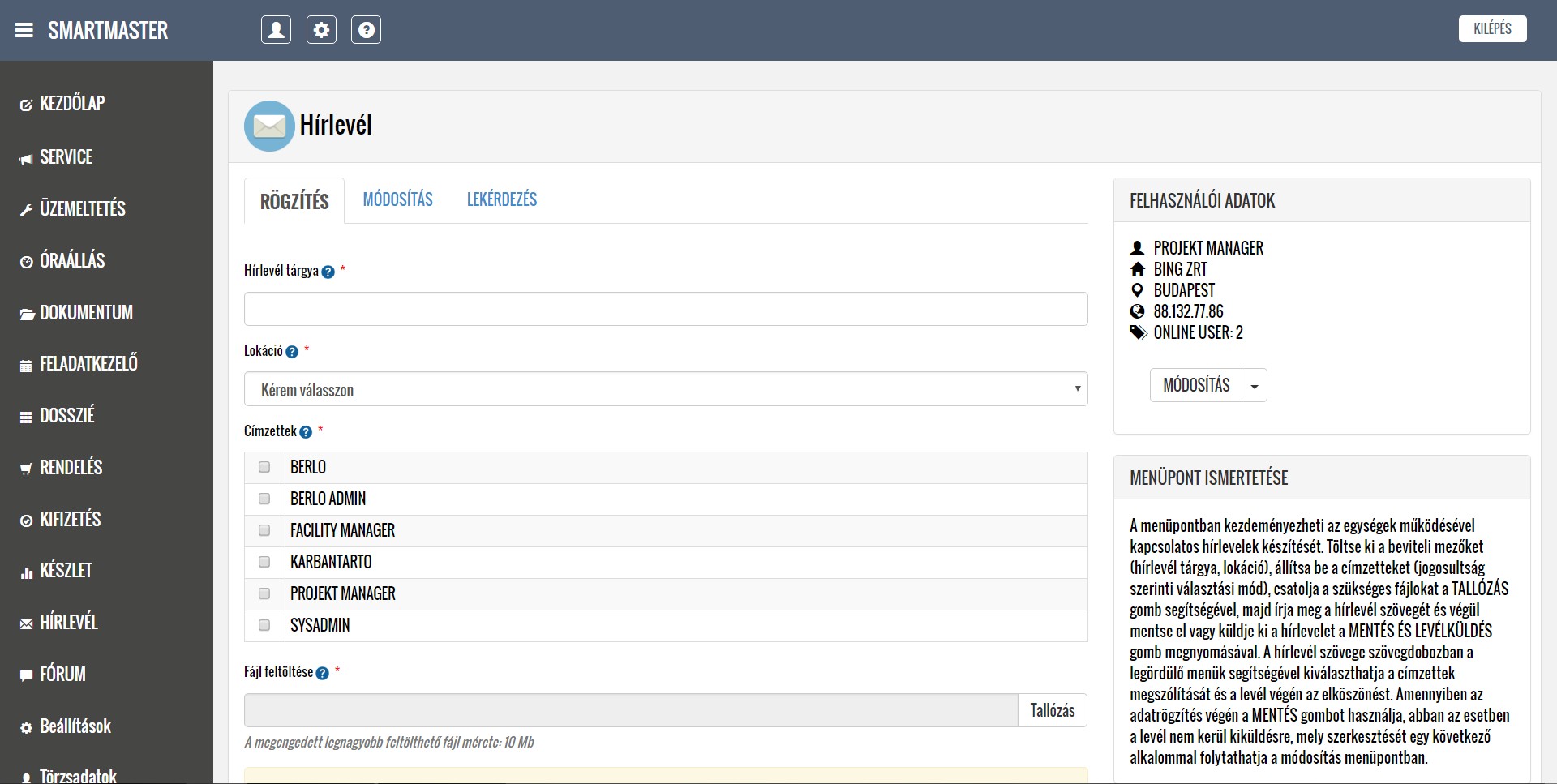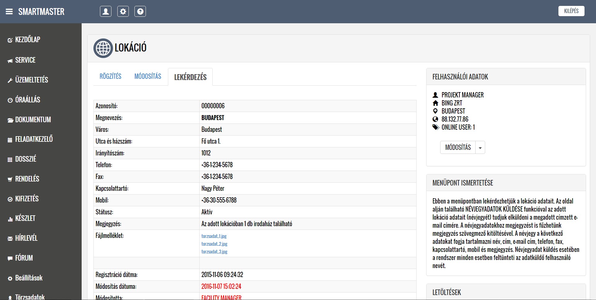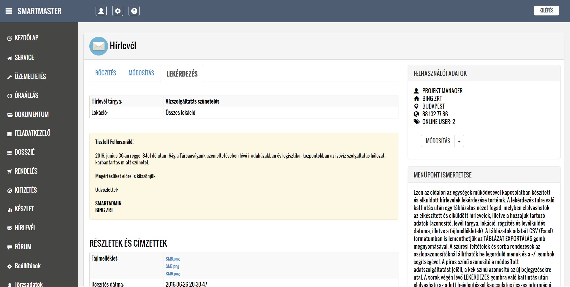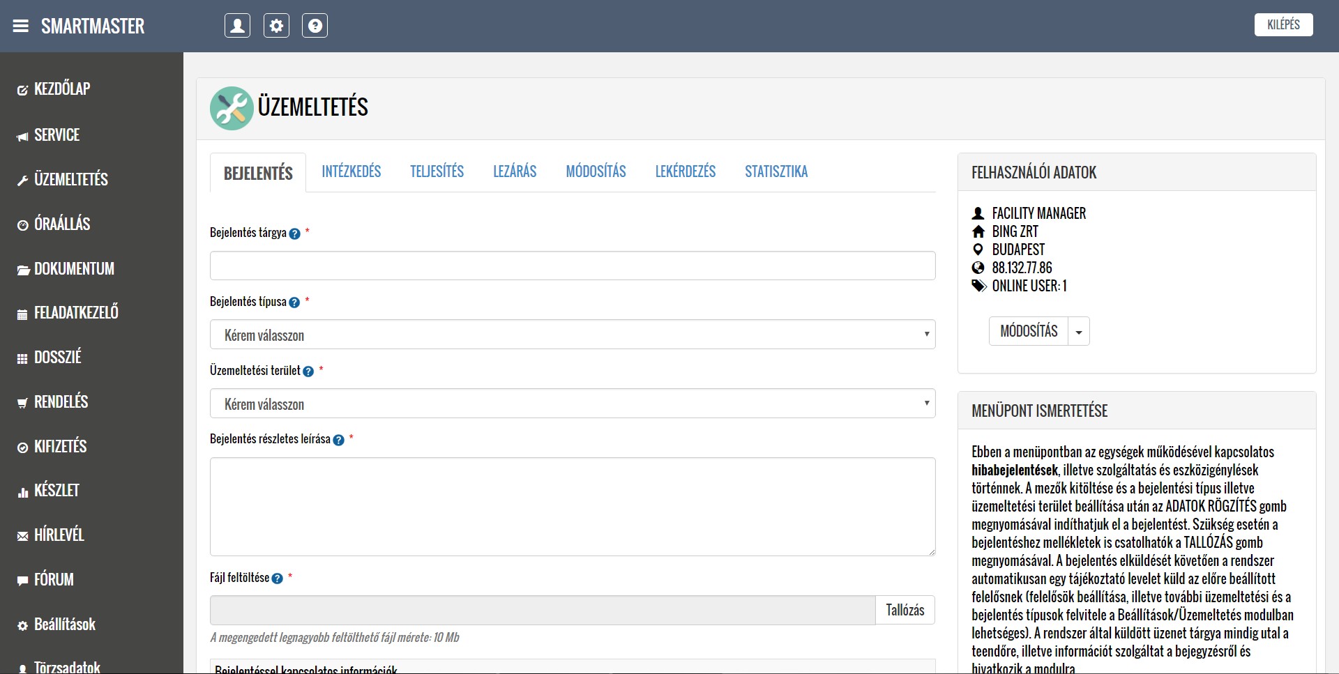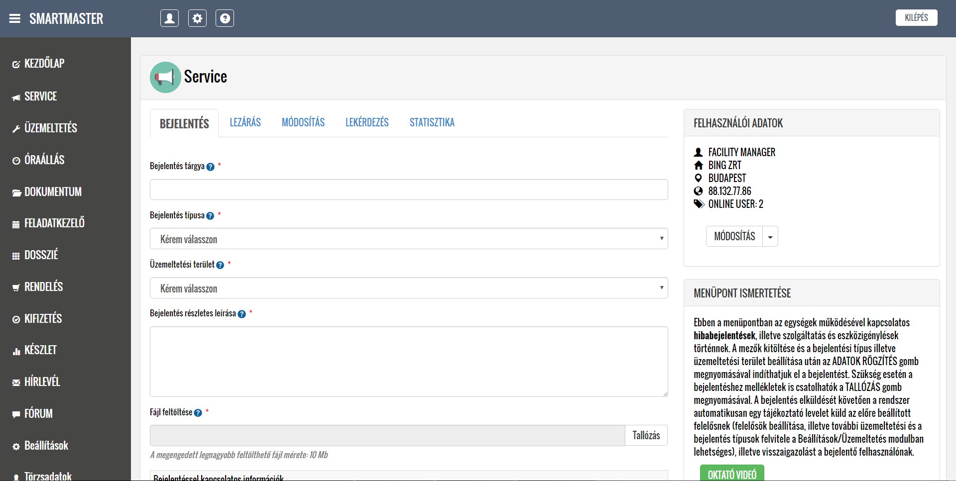 Beszélgessünk !A SMARTGENERAL rendszer egy modulokból felépülő adatbázis alapú online épületüzemeltetési szoftver (facility management szoftver), mely alkalmas vagyonkezelők, épületüzemeltetők, pénzintézetek, önkormányzatok, kis és középvállalkozások elektronikus dokumentumkezelésére, ingatlanok üzemeltetésére, hibabejelentések kezelésére, belső kommunikációra (hírlevél és fórum), közüemi mérőórák fogyasztásainak rögzítésére, ismétlődő feladatok kezelésére, készletek nyilvántartására, rendelések lebonyolítására, projektkezelésre és a napi működéssel kapcsolatos egyedi nyilvántartások vezetésére. A rendszer fejlesztésénél elsődleges szempont volt az egyszerű kezelhetőség, felhasználóbarát felület, számítógépekre és okos telefonokra való optimalizálás, illetve a gyors és hatékony ügyintézési folyamatok alkalmazása. A különböző területek felelősei egyedileg beállíthatók a jogosultsági rendszer használatával (ügyintézők, karbantartók, középvezetők, facility managerek, felsővezetők és projekt managerek).