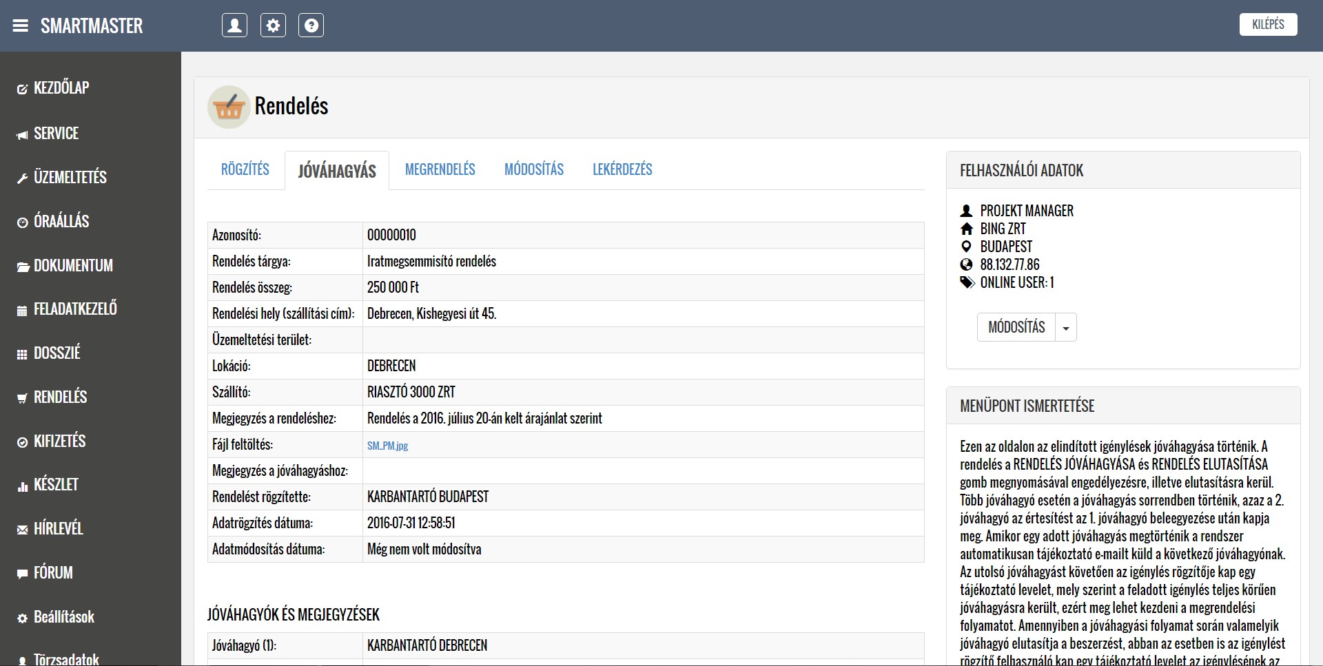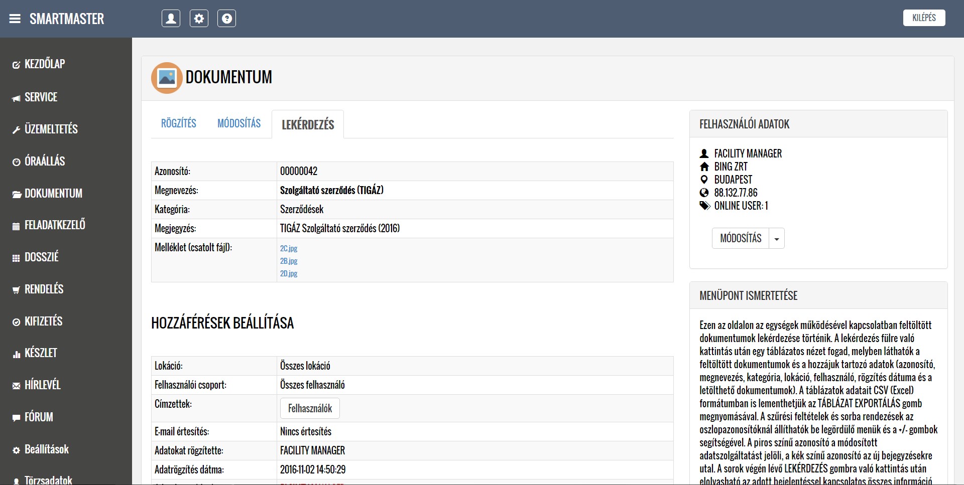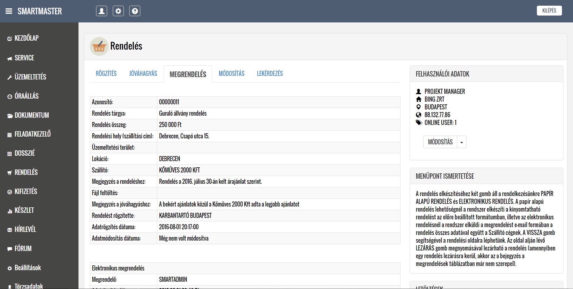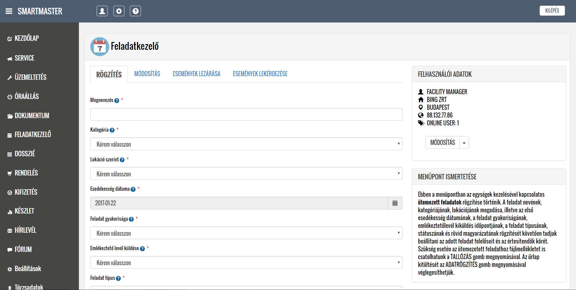 Beszélgessünk !A SMARTGENERAL rendszer egy modulokból felépülő adatbázis alapú online épületüzemeltetési szoftver (facility management szoftver), mely alkalmas vagyonkezelők, épületüzemeltetők, pénzintézetek, önkormányzatok, kis és középvállalkozások elektronikus dokumentumkezelésére, ingatlanok üzemeltetésére, hibabejelentések kezelésére, belső kommunikációra (hírlevél és fórum), közüemi mérőórák fogyasztásainak rögzítésére, ismétlődő feladatok kezelésére, készletek nyilvántartására, rendelések lebonyolítására, projektkezelésre és a napi működéssel kapcsolatos egyedi nyilvántartások vezetésére. A rendszer fejlesztésénél elsődleges szempont volt az egyszerű kezelhetőség, felhasználóbarát felület, számítógépekre és okos telefonokra való optimalizálás, illetve a gyors és hatékony ügyintézési folyamatok alkalmazása. A különböző területek felelősei egyedileg beállíthatók a jogosultsági rendszer használatával (ügyintézők, karbantartók, középvezetők, facility managerek, felsővezetők és projekt managerek).
