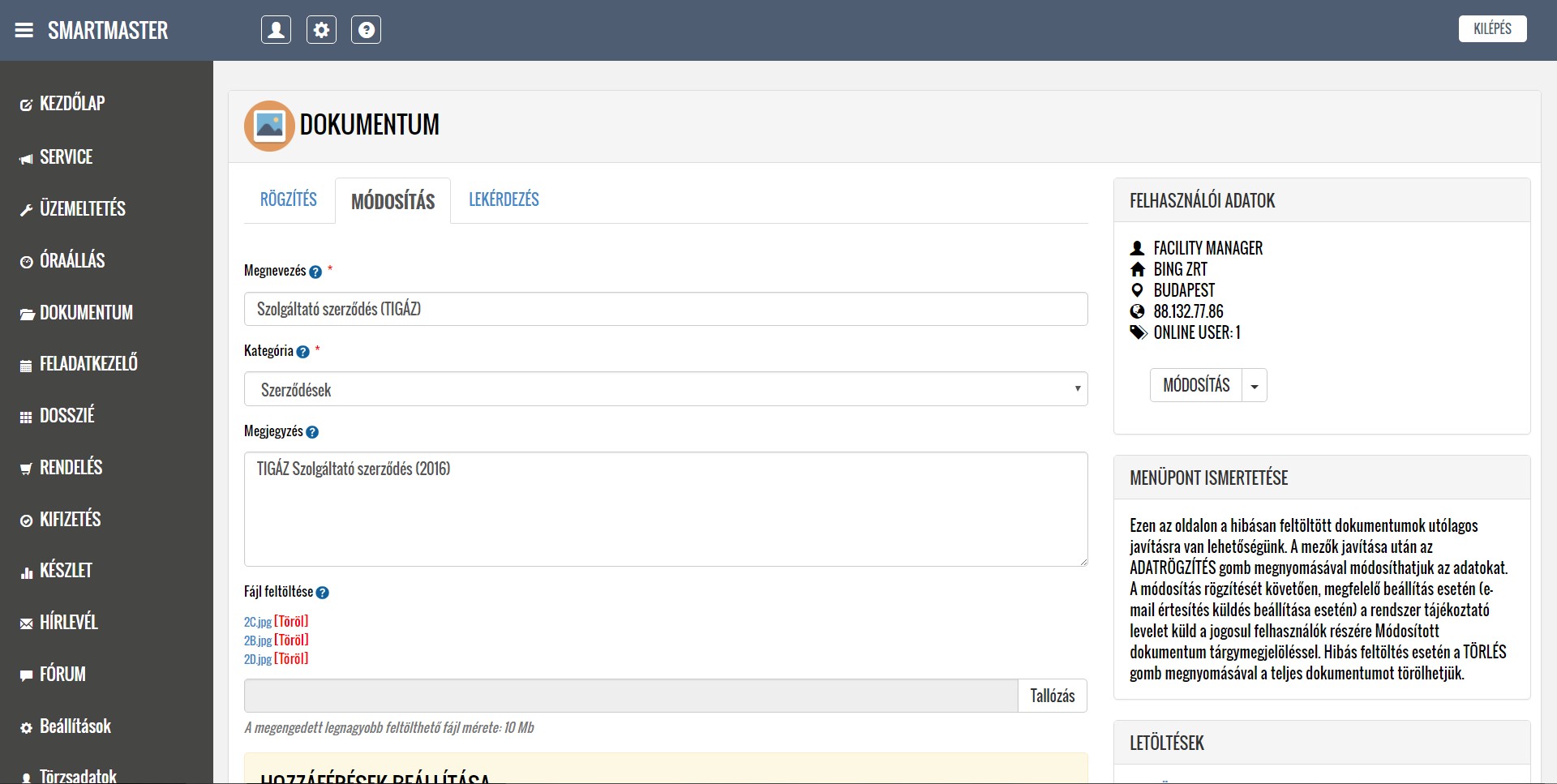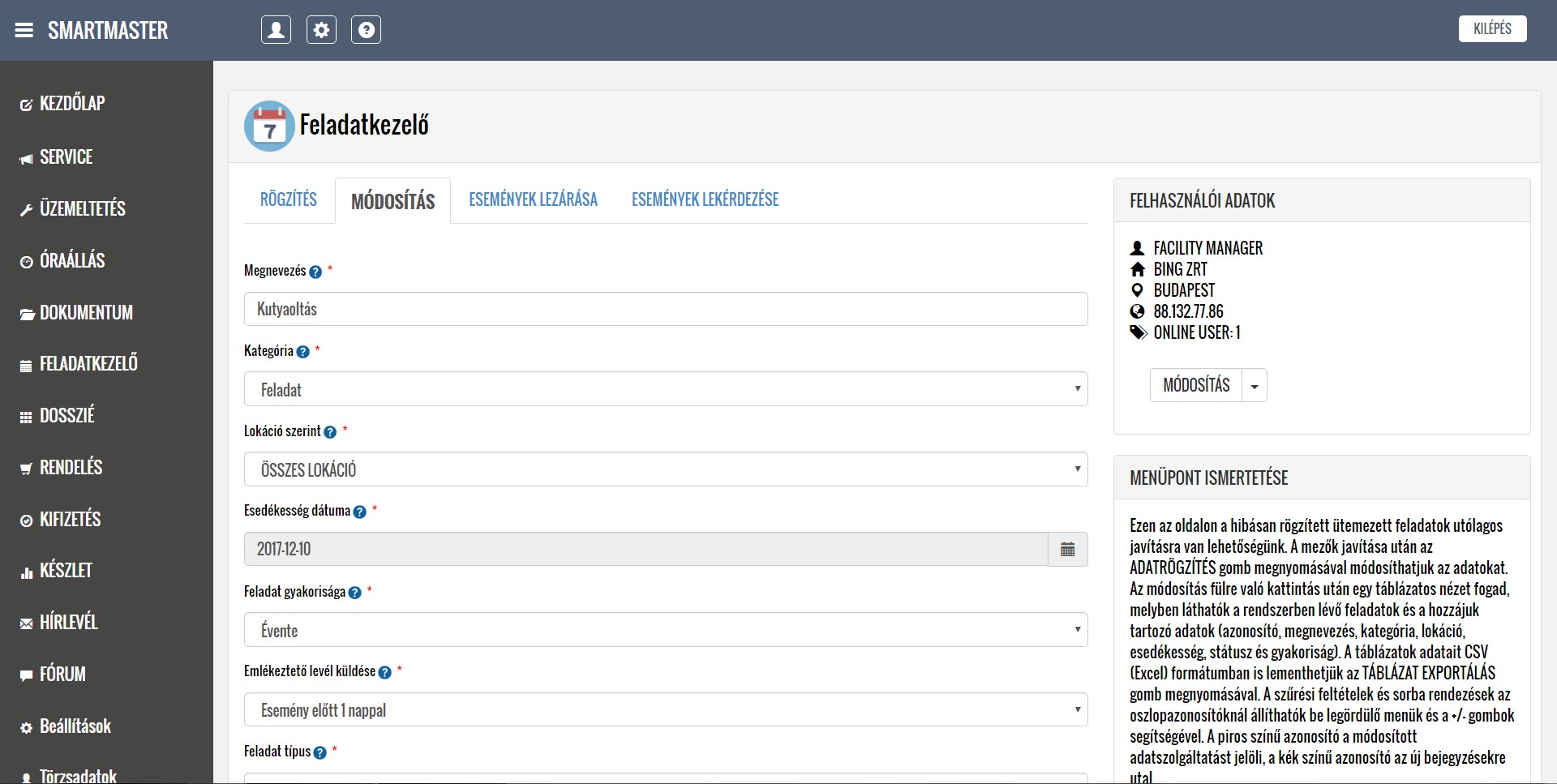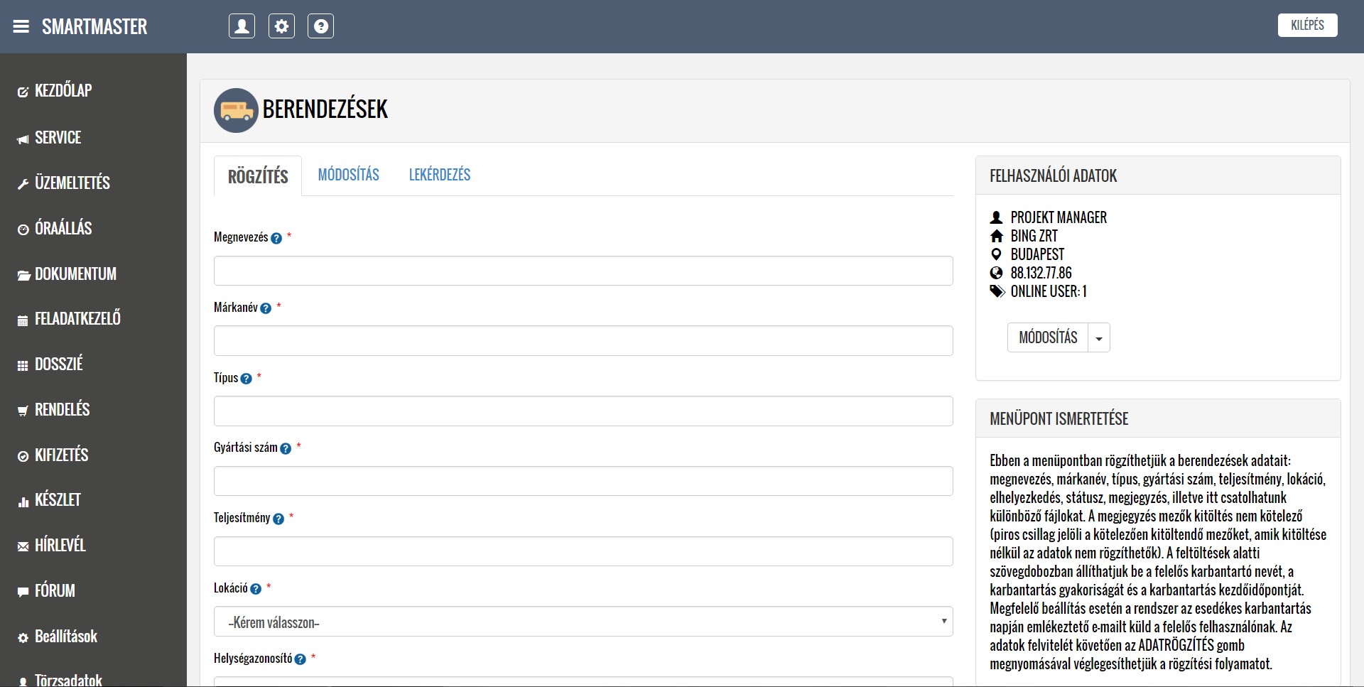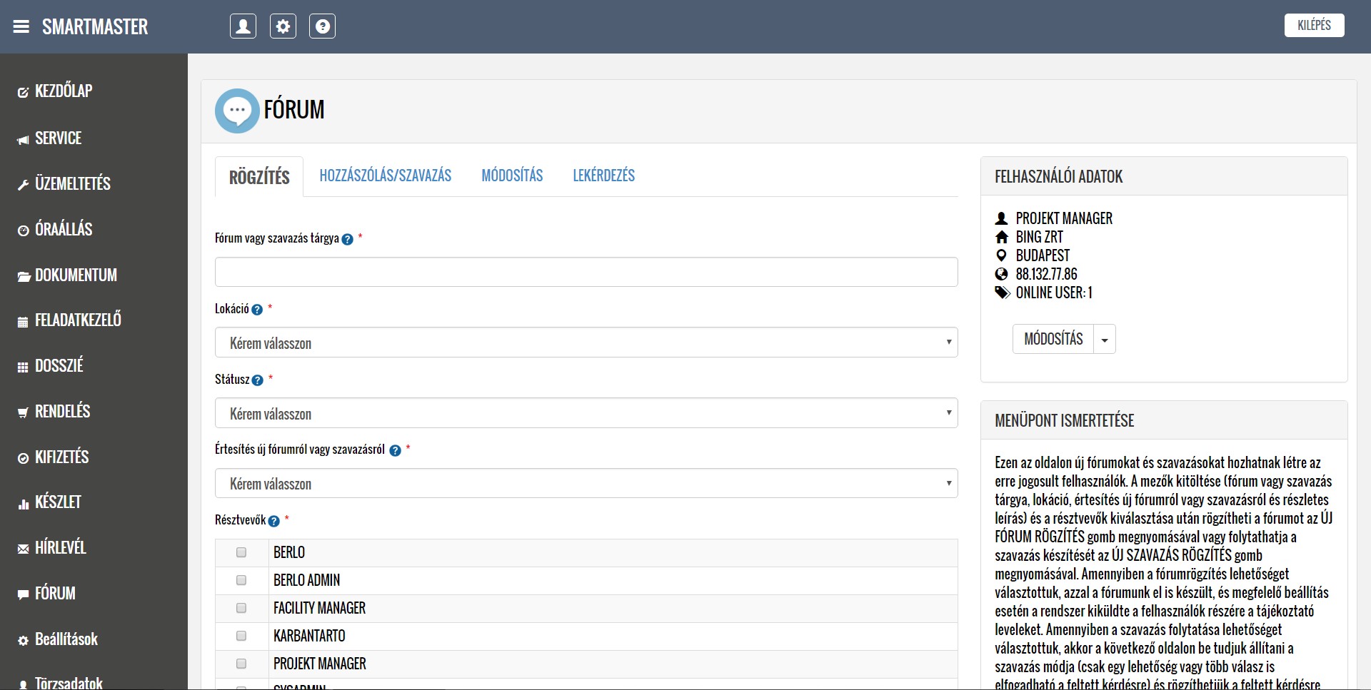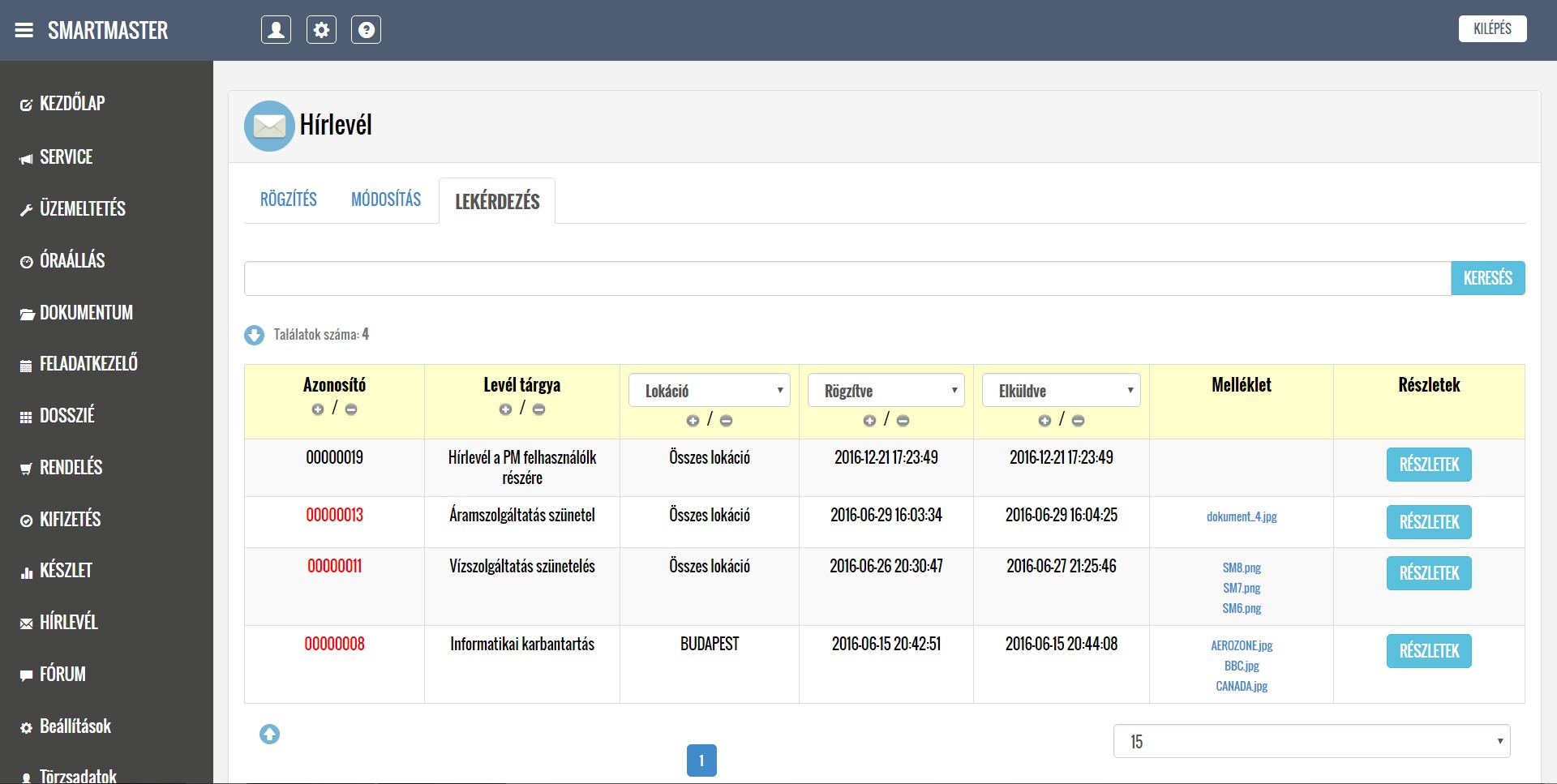 Beszélgessünk !A SMARTGENERAL rendszer egy modulokból felépülő adatbázis alapú online épületüzemeltetési szoftver (facility management szoftver), mely alkalmas vagyonkezelők, épületüzemeltetők, pénzintézetek, önkormányzatok, kis és középvállalkozások elektronikus dokumentumkezelésére, ingatlanok üzemeltetésére, hibabejelentések kezelésére, belső kommunikációra (hírlevél és fórum), közüemi mérőórák fogyasztásainak rögzítésére, ismétlődő feladatok kezelésére, készletek nyilvántartására, rendelések lebonyolítására, projektkezelésre és a napi működéssel kapcsolatos egyedi nyilvántartások vezetésére. A rendszer fejlesztésénél elsődleges szempont volt az egyszerű kezelhetőség, felhasználóbarát felület, számítógépekre és okos telefonokra való optimalizálás, illetve a gyors és hatékony ügyintézési folyamatok alkalmazása. A különböző területek felelősei egyedileg beállíthatók a jogosultsági rendszer használatával (ügyintézők, karbantartók, középvezetők, facility managerek, felsővezetők és projekt managerek).