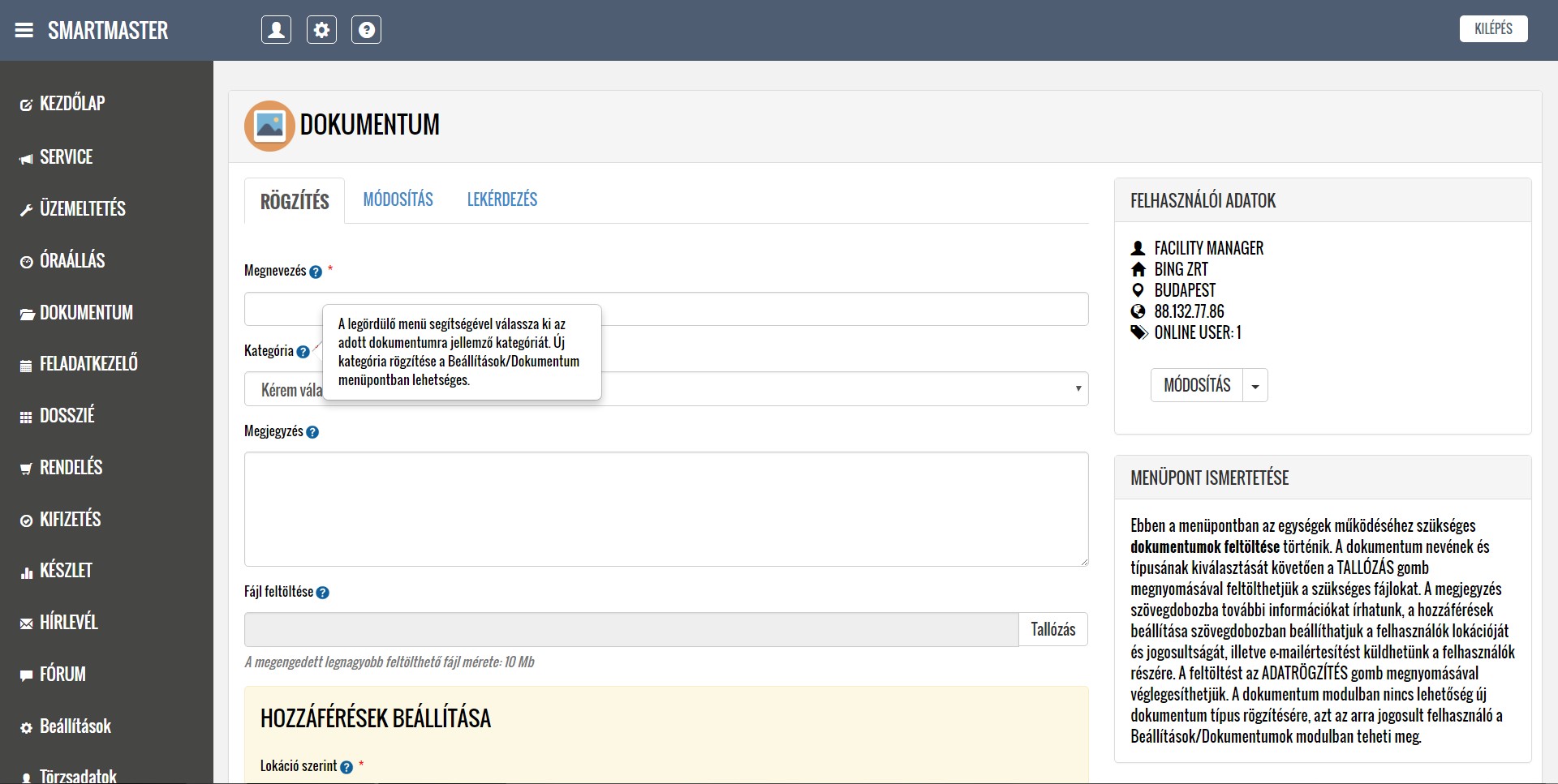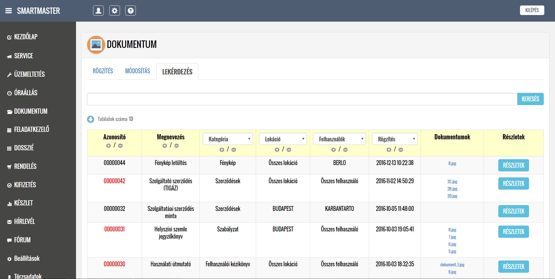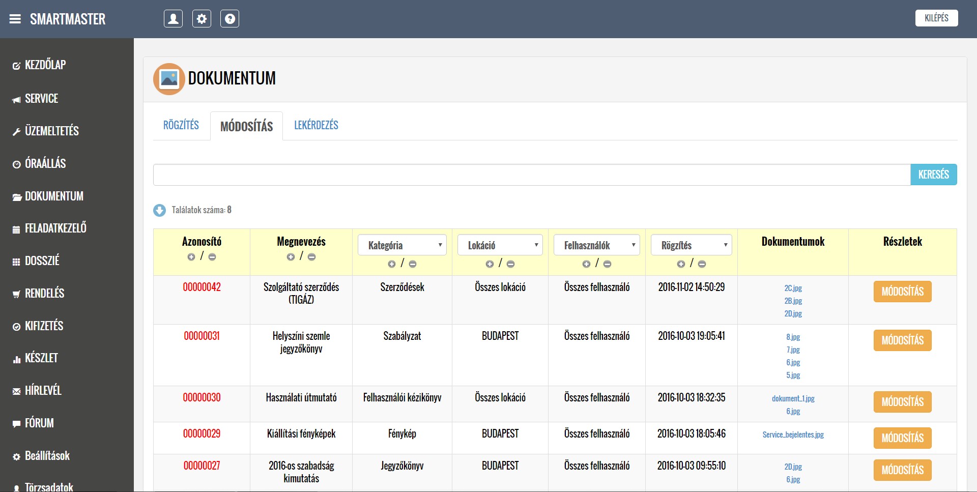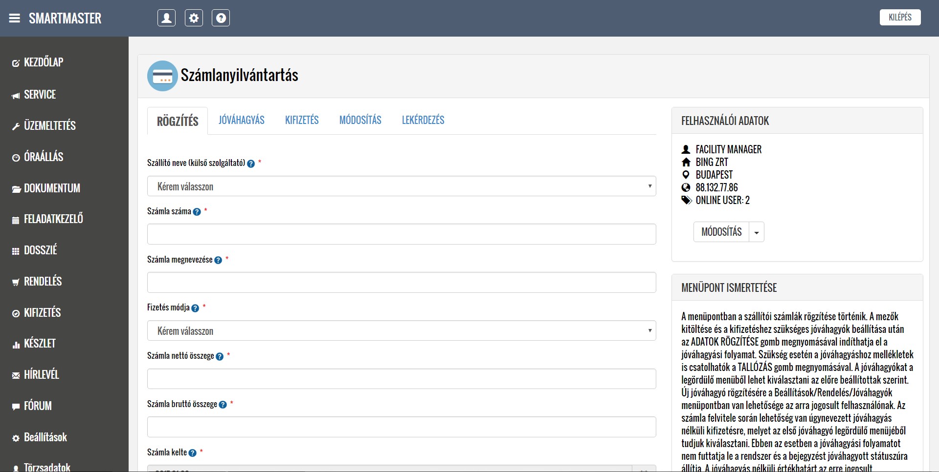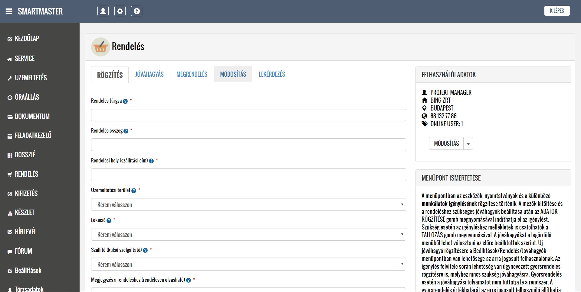 Beszélgessünk !A SMARTGENERAL rendszer egy modulokból felépülő adatbázis alapú online épületüzemeltetési szoftver (facility management szoftver), mely alkalmas vagyonkezelők, épületüzemeltetők, pénzintézetek, önkormányzatok, kis és középvállalkozások elektronikus dokumentumkezelésére, ingatlanok üzemeltetésére, hibabejelentések kezelésére, belső kommunikációra (hírlevél és fórum), közüemi mérőórák fogyasztásainak rögzítésére, ismétlődő feladatok kezelésére, készletek nyilvántartására, rendelések lebonyolítására, projektkezelésre és a napi működéssel kapcsolatos egyedi nyilvántartások vezetésére. A rendszer fejlesztésénél elsődleges szempont volt az egyszerű kezelhetőség, felhasználóbarát felület, számítógépekre és okos telefonokra való optimalizálás, illetve a gyors és hatékony ügyintézési folyamatok alkalmazása. A különböző területek felelősei egyedileg beállíthatók a jogosultsági rendszer használatával (ügyintézők, karbantartók, középvezetők, facility managerek, felsővezetők és projekt managerek).