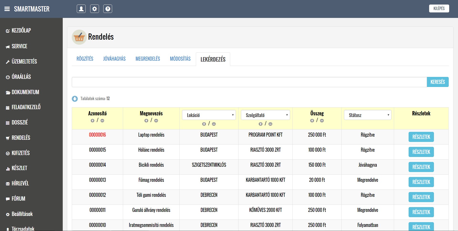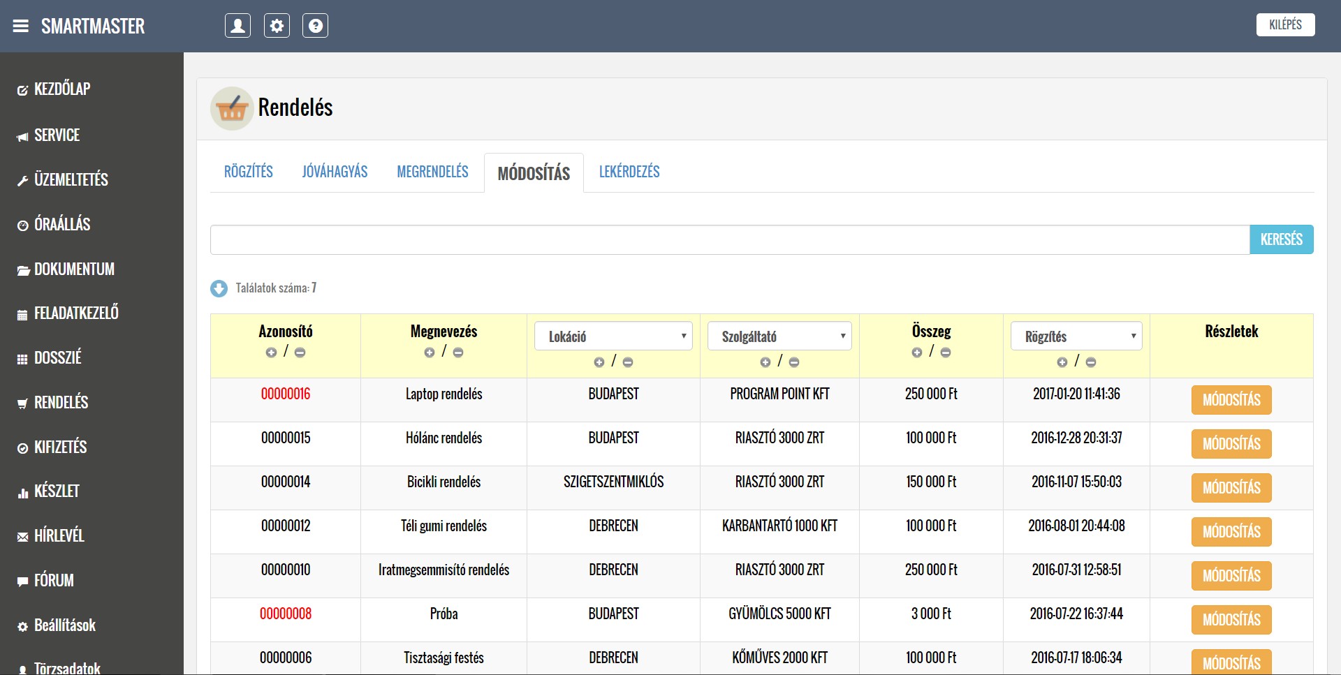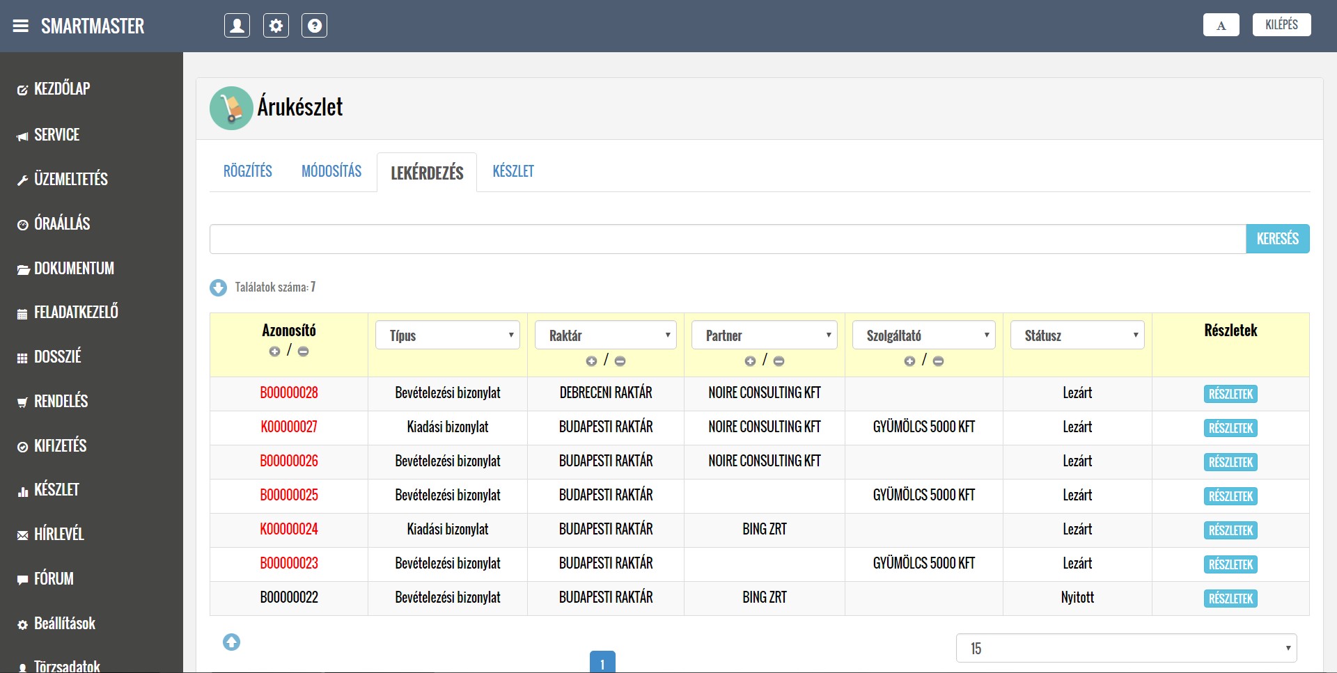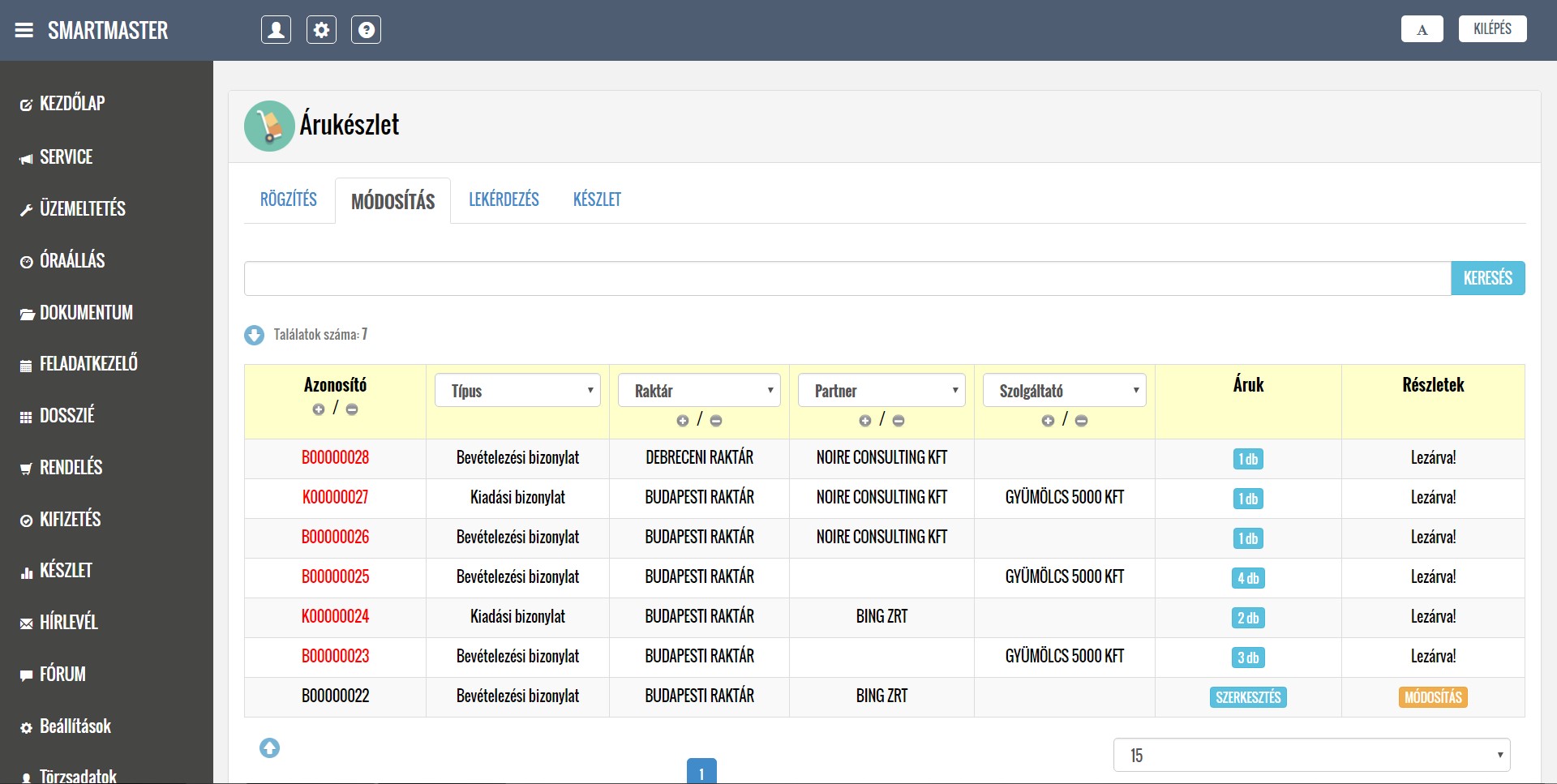 DEMO alkalmazásban elérhető üzleti modulok (7/14)